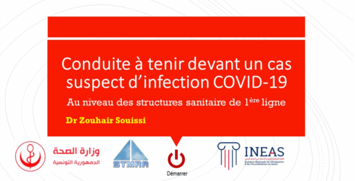 Dans le but de partage d'expériences et de conduites de pays de l'EFP, nous vous proposons l'expérience Tunisienne à travers ce guide de parcours de soins du patient suspect ou atteint par le Covid-19, validé par les experts de l'INEAS (agence national d'évaluation et d'accréditation en santé) et repris par Dr Souissi Zouhair sous forme d'un diaporama de navigation interactive.